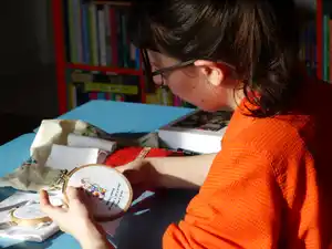 Issue du graphisme et de la bande dessinée, le fil reçu en héritage, je suis fascinée par les miniatures demandant à ce que l'on s'approche pour révéler leur magie. La broderie a le pouvoir, elle, de me plonger dans un temps suspendu où rien